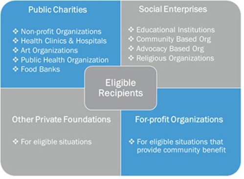 Like grants, eligibility of recipients and investments for PRI funds are shaped by Internal Revenue Code requirements, fiduciary standards, and philanthropic practice, again, with the primary objective that the exempt purpose of the foundation (i.e., its mission) is satisfied. It is not uncommon that recipients of PRIs are entities that have previously received grants from the foundation.
